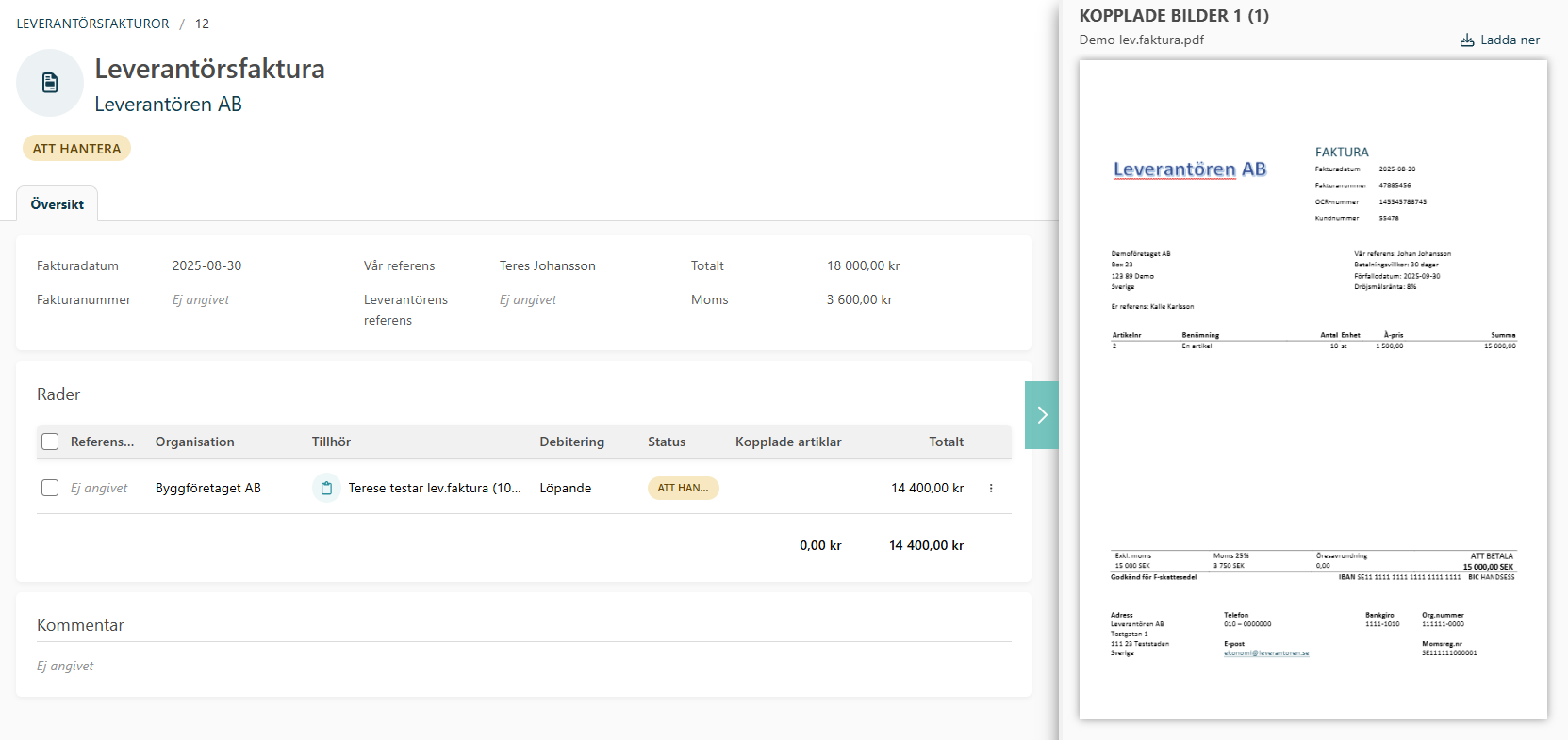 Fakturorna registreras automatiskt och matchas direkt mot rätt projekt eller arbetsorder. Det innebär att risken för felregistreringar, fel i faktureringen till kund eller borttappade kostnader minskar radikalt.